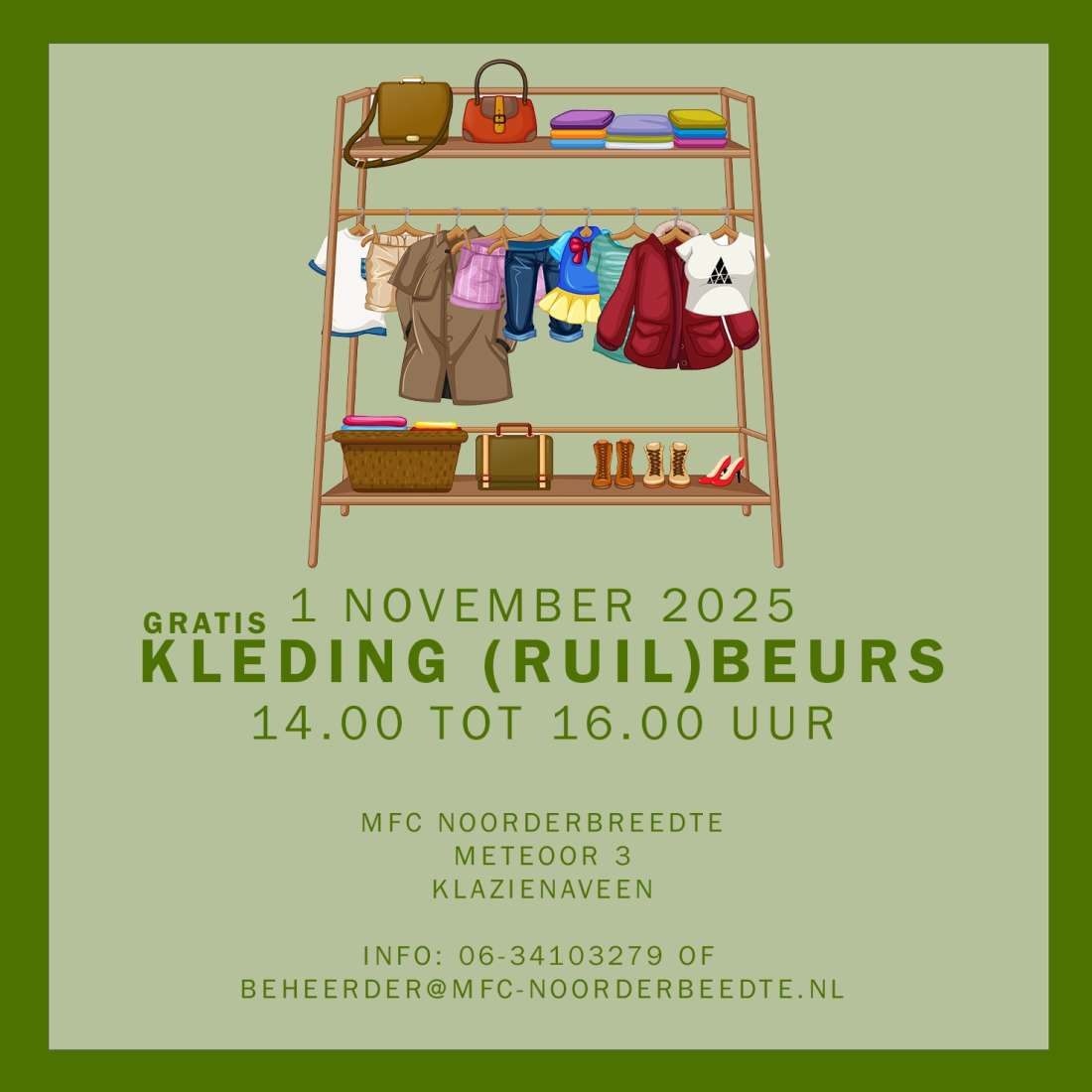 Zaterdag 1 november 2025 van 14.00 tot 16.00 uur kunt u weer komen ruilen op de kledingruilbeurs.