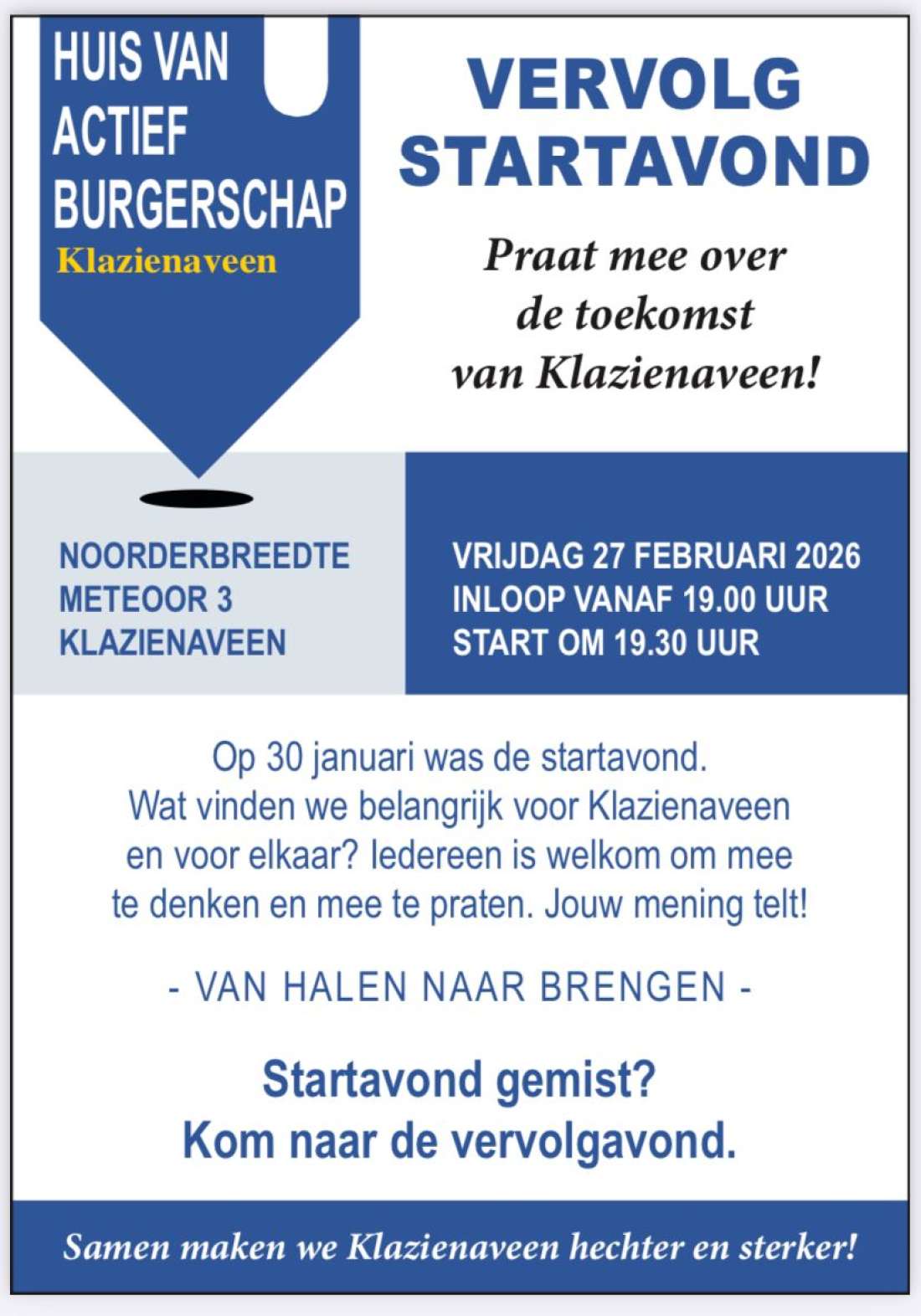 Klazienaveen heeft kracht. Dat bleek wel tijdens de startavond op 30 januari; de zaal zat voller dan verwacht. Er leeft iets in ons dorp. Betrokkenheid, energie en naoberschap. Soms moet je het alleen even samen opnieuw ontdekken.